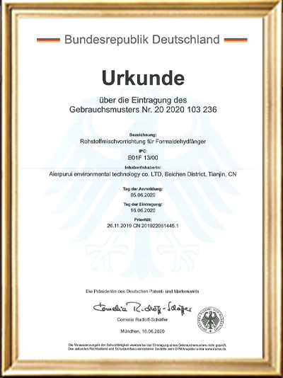 實用新型專利證書(一種甲醛清除劑的原料混合